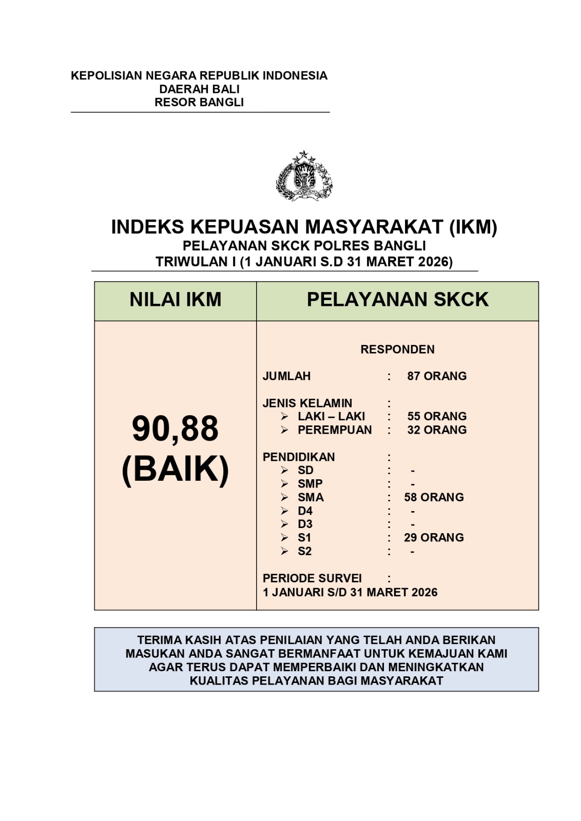 Selamat datang di Pelayanan SKCK Polres Bangli, tempat Anda mendapatkan Surat Keterangan Catatan Kepolisian dengan mudah, cepat, dan terpercaya.