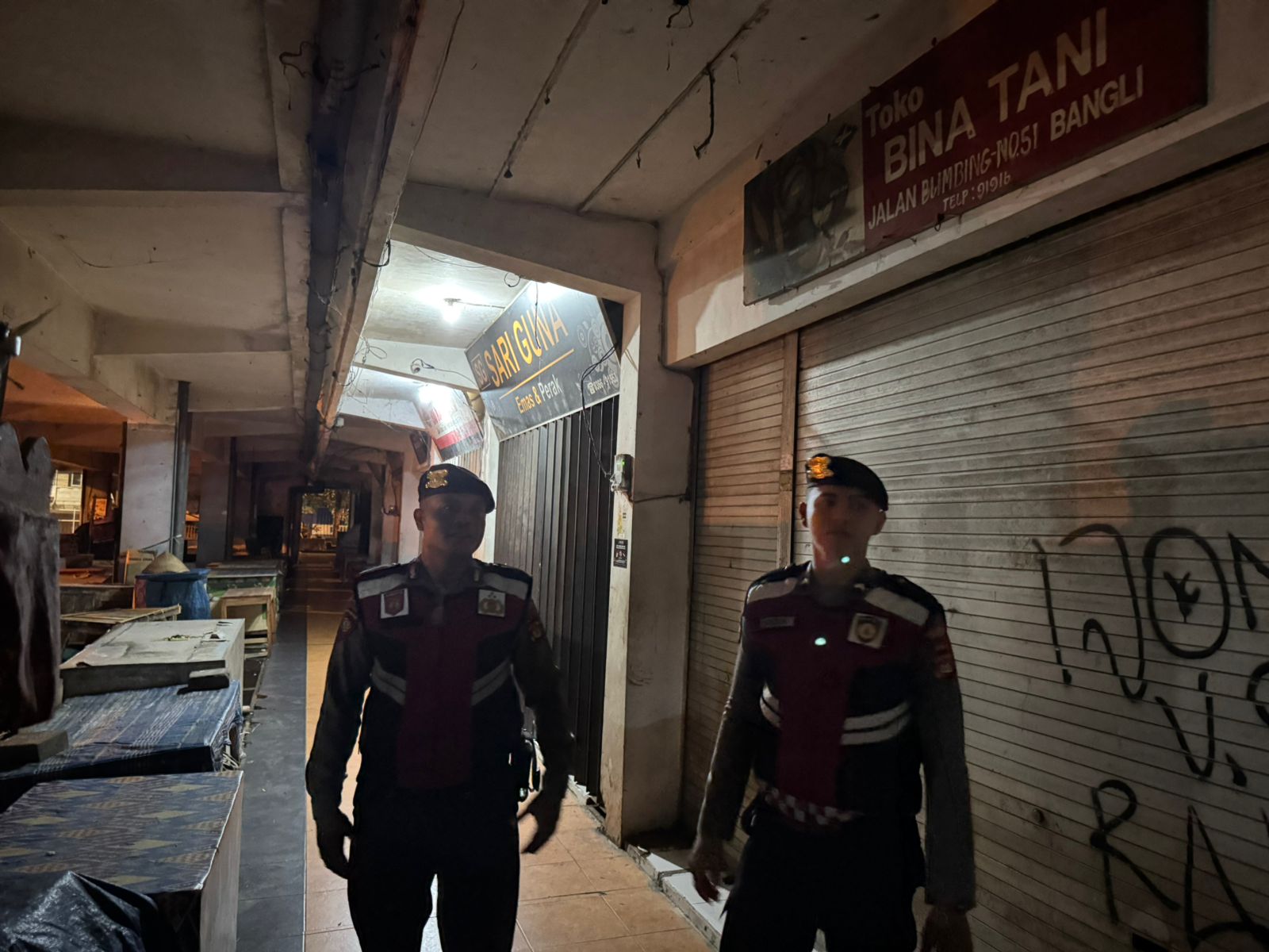 Antisipasi Gangguan Kamtibmas Pada Malam Hari, Personil Samapta Polres Bangli Lakukan Patroli Malam di Areal Pertokoan Pasar Kidul Bangli.