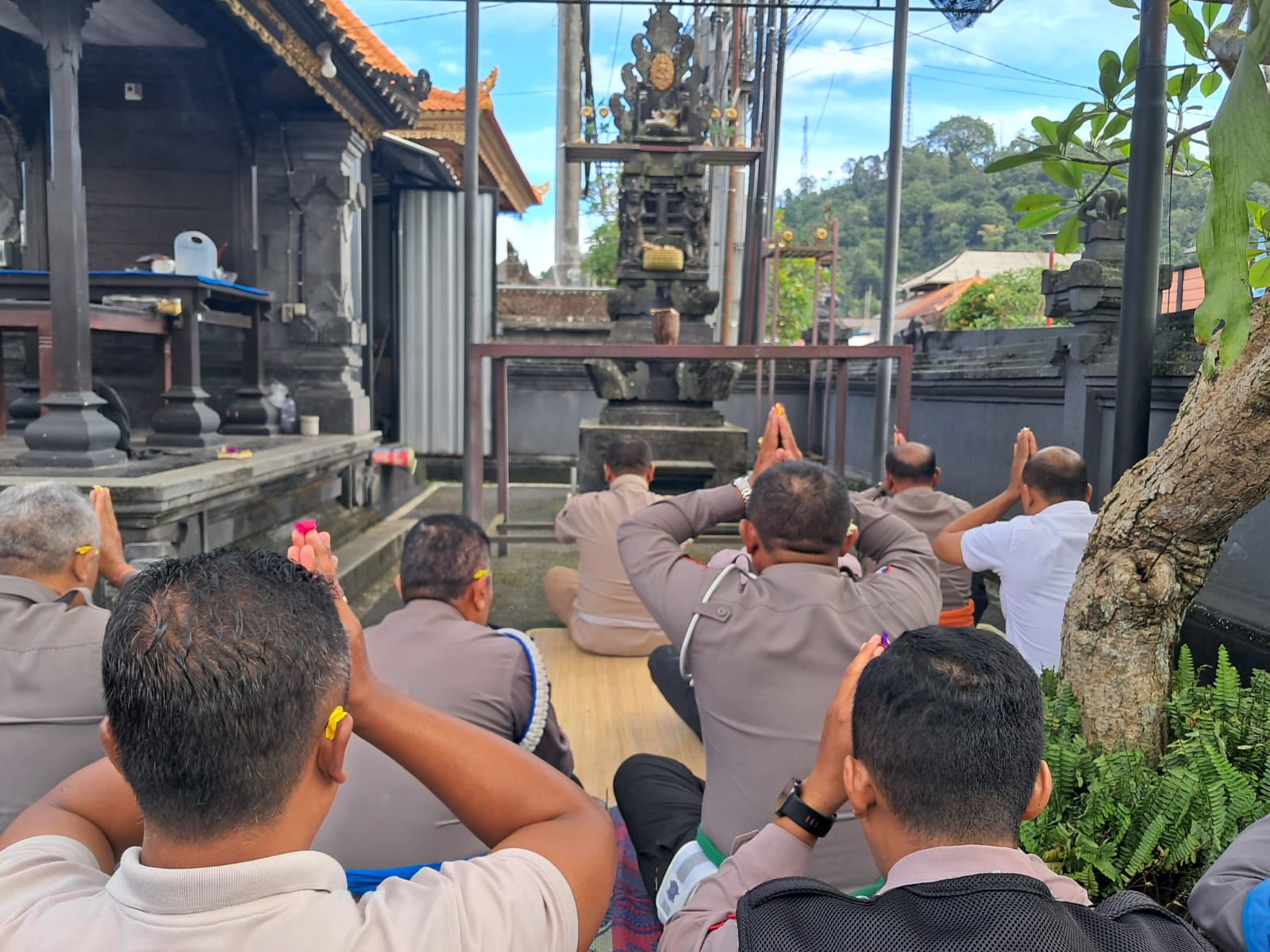 Personil Polsek Bangli Laksanakan Persembahyangan Bersama di Padmasana Polsek