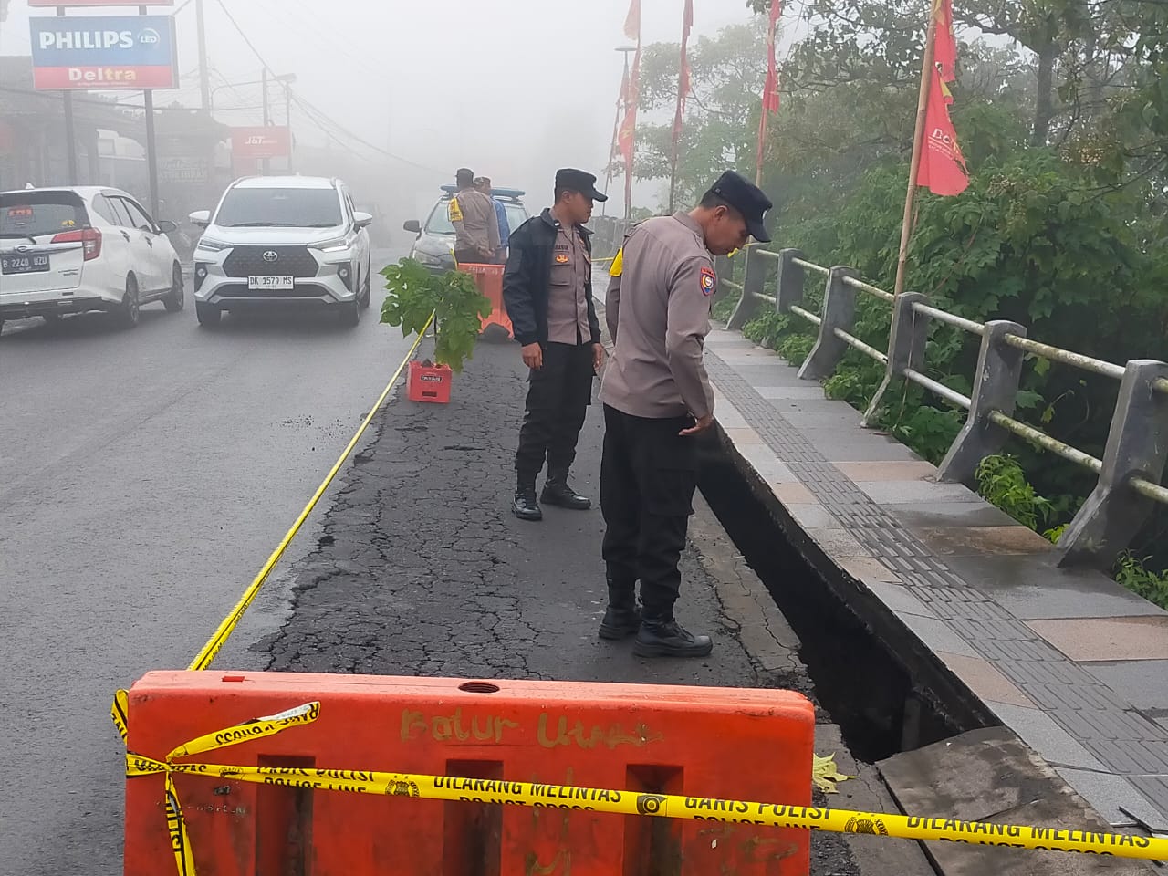 Trotoar Jalan Raya Penelokan–Kintamani Jebol Akibat Hujan Deras, Polsek Kintamani Pasang Rambu Pengaman